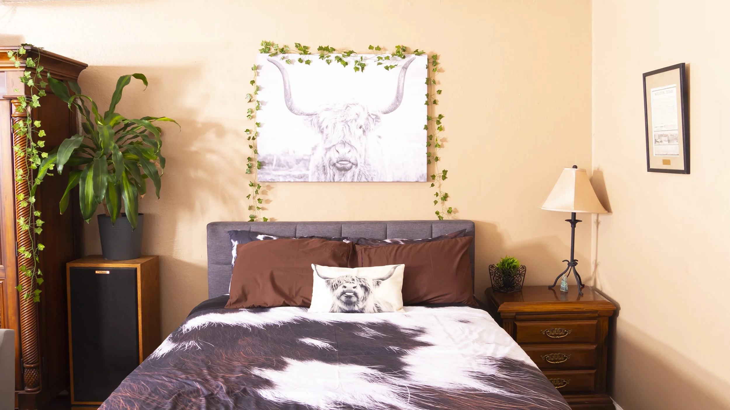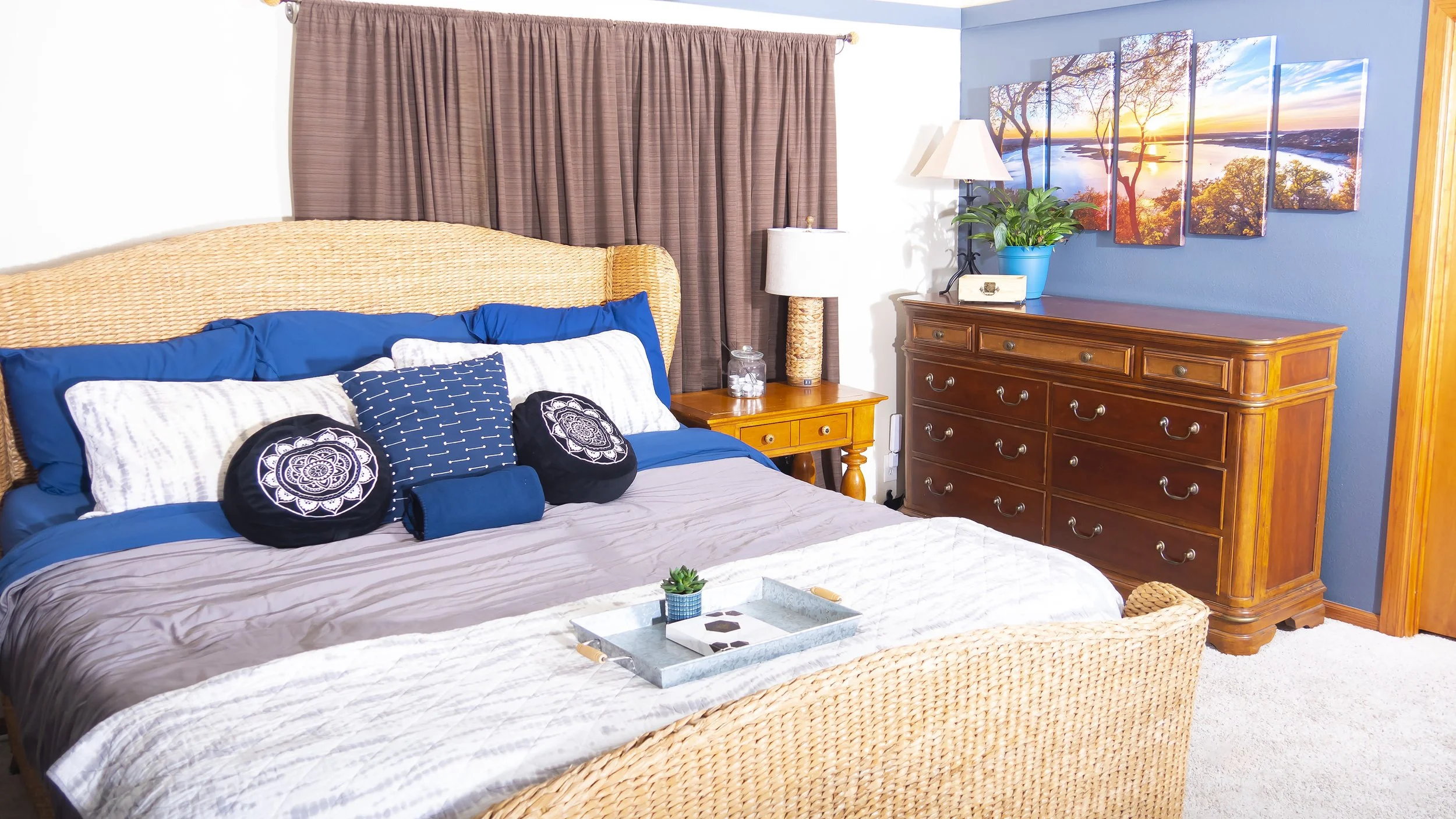 The kitchen is fully stocked with all of the appliances and amenities you’d find at home, including a coffee maker, dish washer, and the double-door fridge (+extra full fridge) with plenty of room for your vacation groceries. The kitchen also has a breakfast table plus a marble-top bar giving extra room for prepping, eating, and socializing. The dining area features an 8-person dining table for your group feasts, and our pop-up yard + patio tables are ideal for your post-lake brunch — yee-haw!