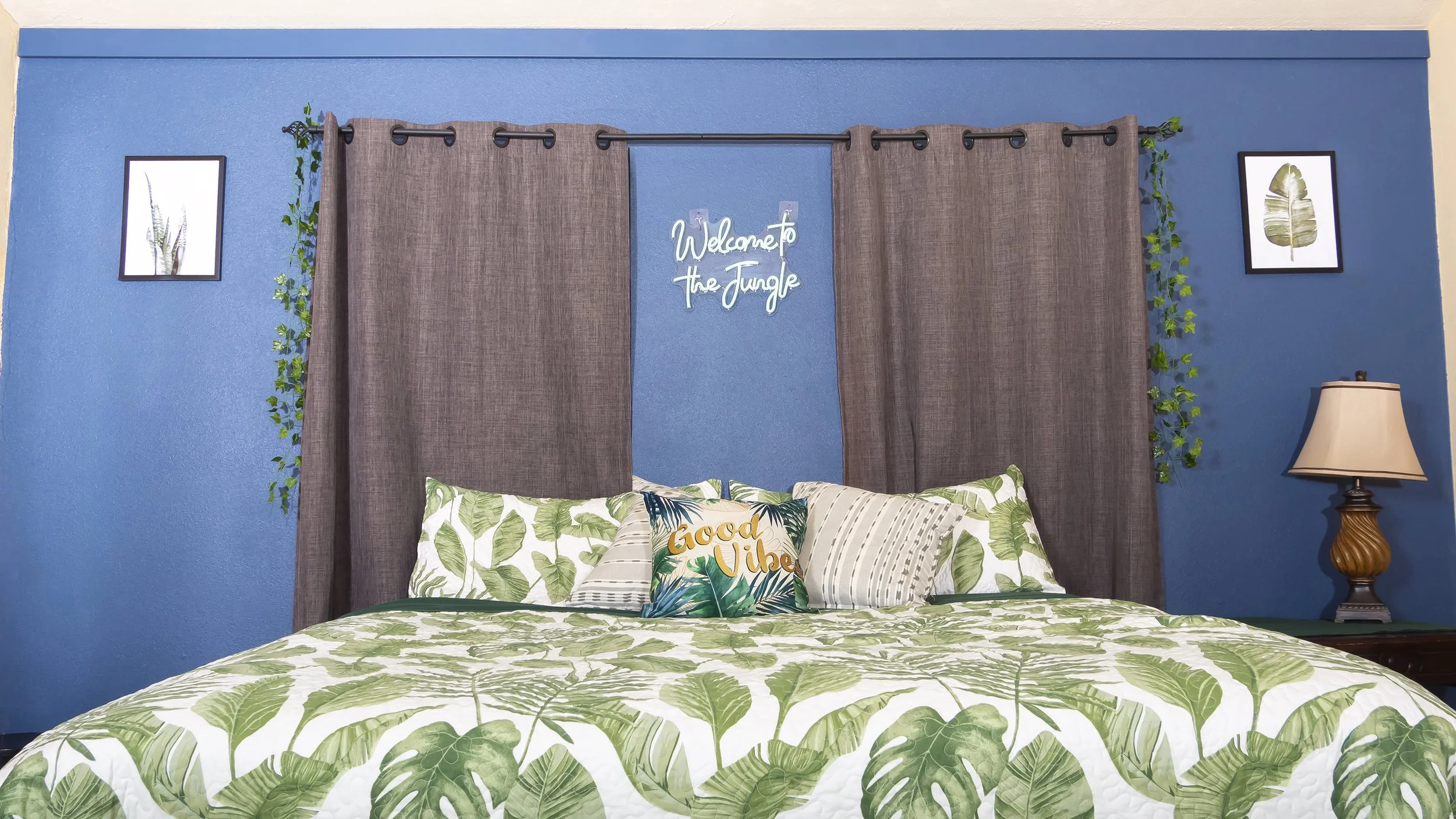 Our living room features a large sectional sofa (very nap-worthy!), built-in sofa lounge, large coffee table, a fireplace for the holiday season, plenty of beautiful natural light, and an industrial projector & screen! Our coffee table is perfect for your favorite family board game or puzzle. Grab the snacks and your favorite 80’s movie — our living room transforms into your personal movie theater every night!